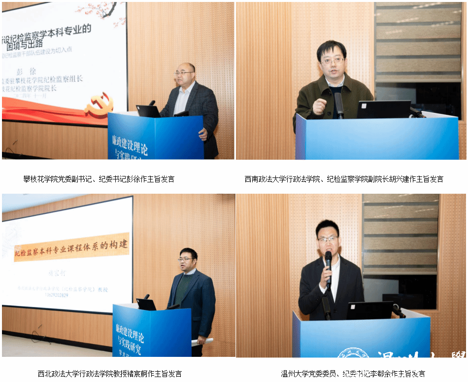 黄色视频 副院长、教授叶肖华主持主旨报告。四川省纪委监委派驻攀枝花学院纪检组长、攀枝花学院党委副书记、纪委书记、攀枝花纪检监察学院院长彭徐作《地方高校新设纪检监察学专业的困境与出路——以基层纪检监察干部队伍建设为切入点》主旨发言,西南政法大学行政黄色视频 、纪检监察学院副院长、教授胡兴建作《正确处理政治与法治的关系,推进纪检监察学学科建设》主旨发言。西北政法大学行政黄色视频 、纪检监察学院教授、监察法学学科带头人褚宸舸作《纪检监察本科专业课程体系的建构》主旨发言。黄色视频 党委委员、纪委书记、省监委驻温大监察专员李都金作《习近平法治思想与纪检监察工作“三个效果”有机统一研究》主旨发言。