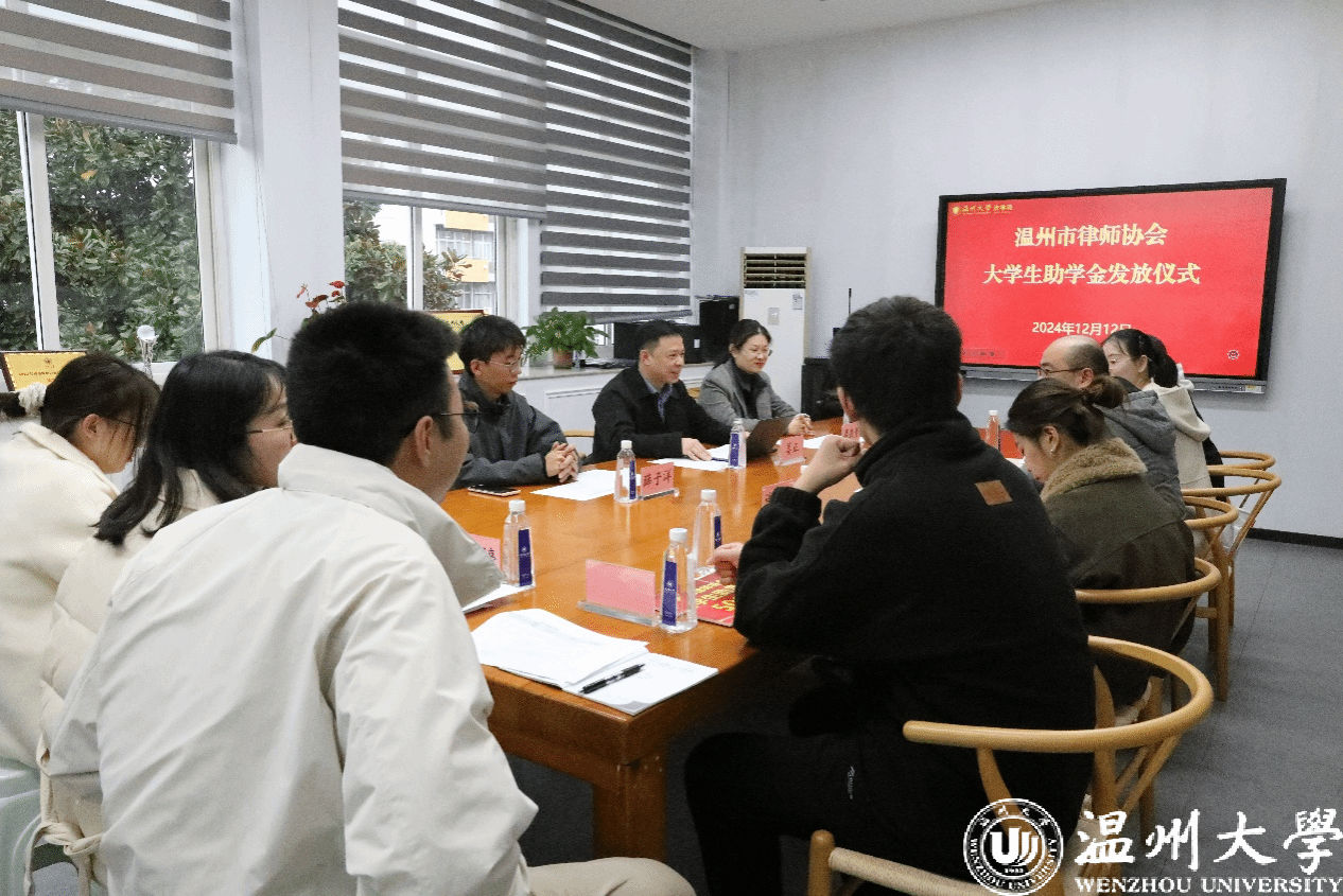 2024年12月12日下午,温州市律师协会来黄色视频 公益开展公益助学活动,助力法治人才培养。温州市律师协会副会长兼温州市律师协会公益与社会责任工作委员会主任姜正,温州市律师协会公益与社会责任委员会秘书长周燕青、实习律师薛子洋一行来黄色视频 ,与受资助学生亲切座谈。学院党委副书记郑兆钧、辅导员谢亭立、蒋玮隽、邱书婷、付玉霞及4名获助学金的学生一同参加发放仪式和座谈会。