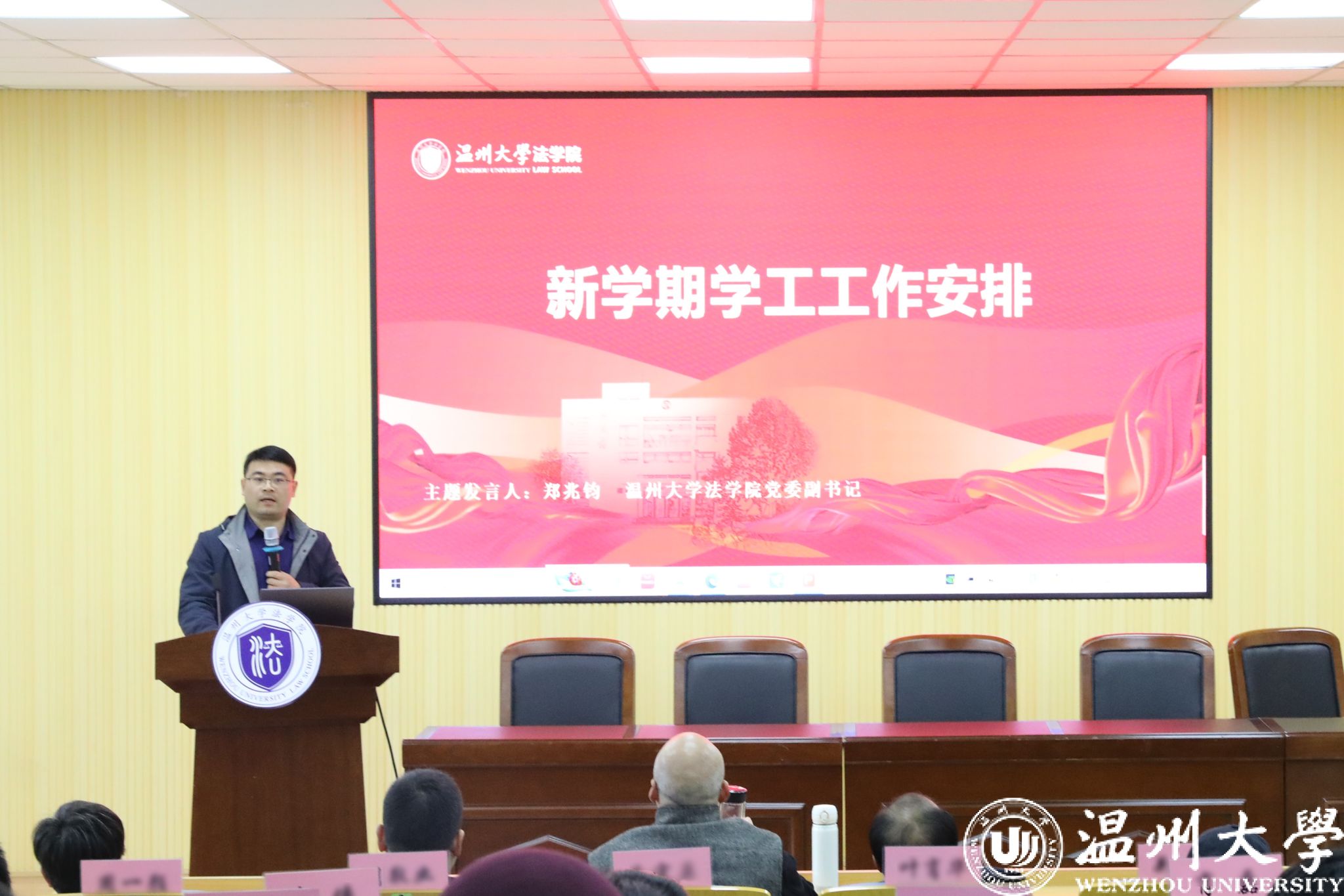 院党委副书记郑兆钧部署新学期学生工作重点任务:一是以创新方式开展学风建设全面提升学院主动学习氛围;二是以学科竞赛为重点协同培养学生专业能力;三是以就业导向联动推进考研、考公、法考、创业工作提升学生就业率;四是以思想引领统筹意识形态、心理健康、人身安全工作保障学院稳定发展。恳请全体老师齐心参与,全员育人、全程育人、全方位育人,共同培育时代新人。