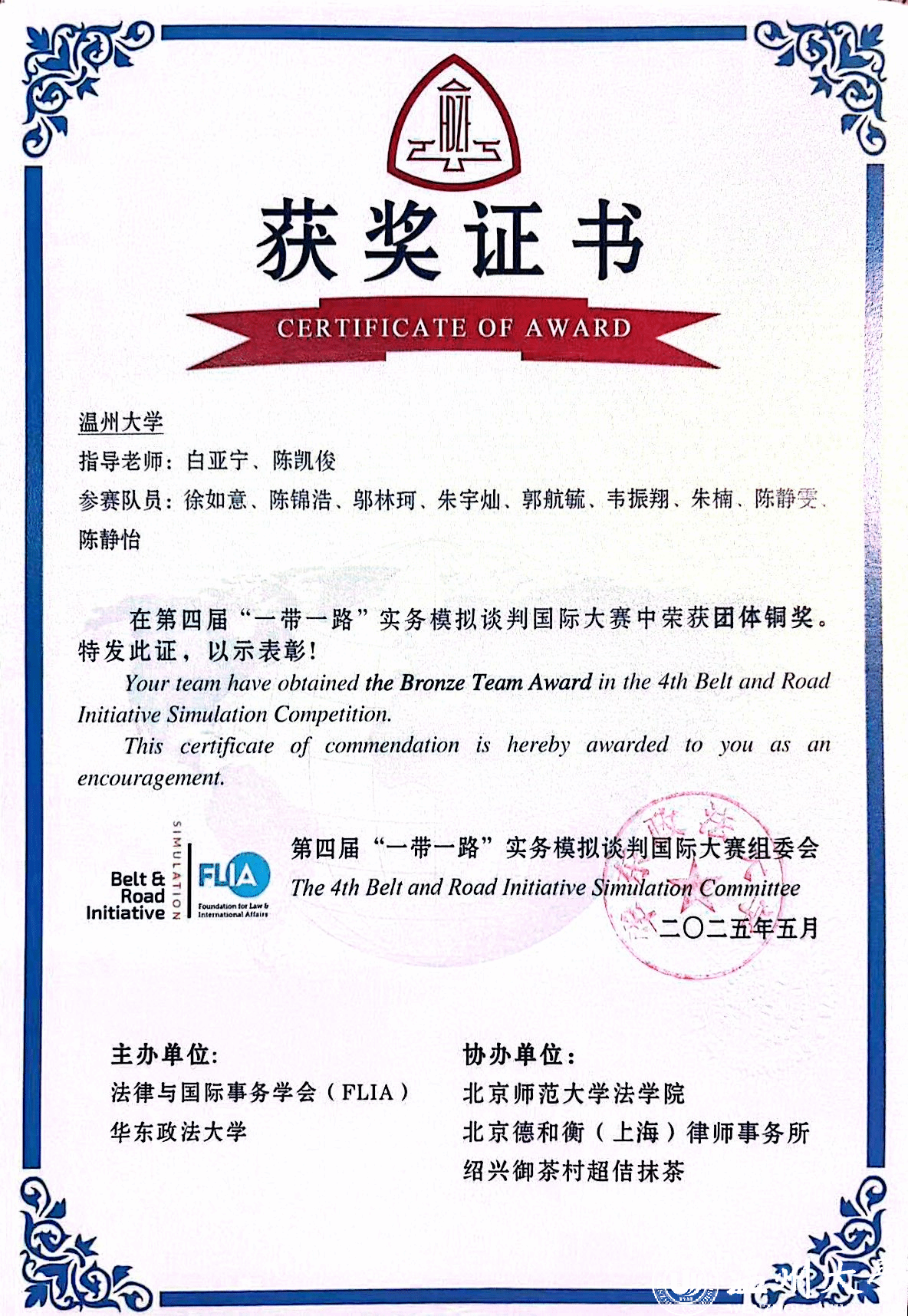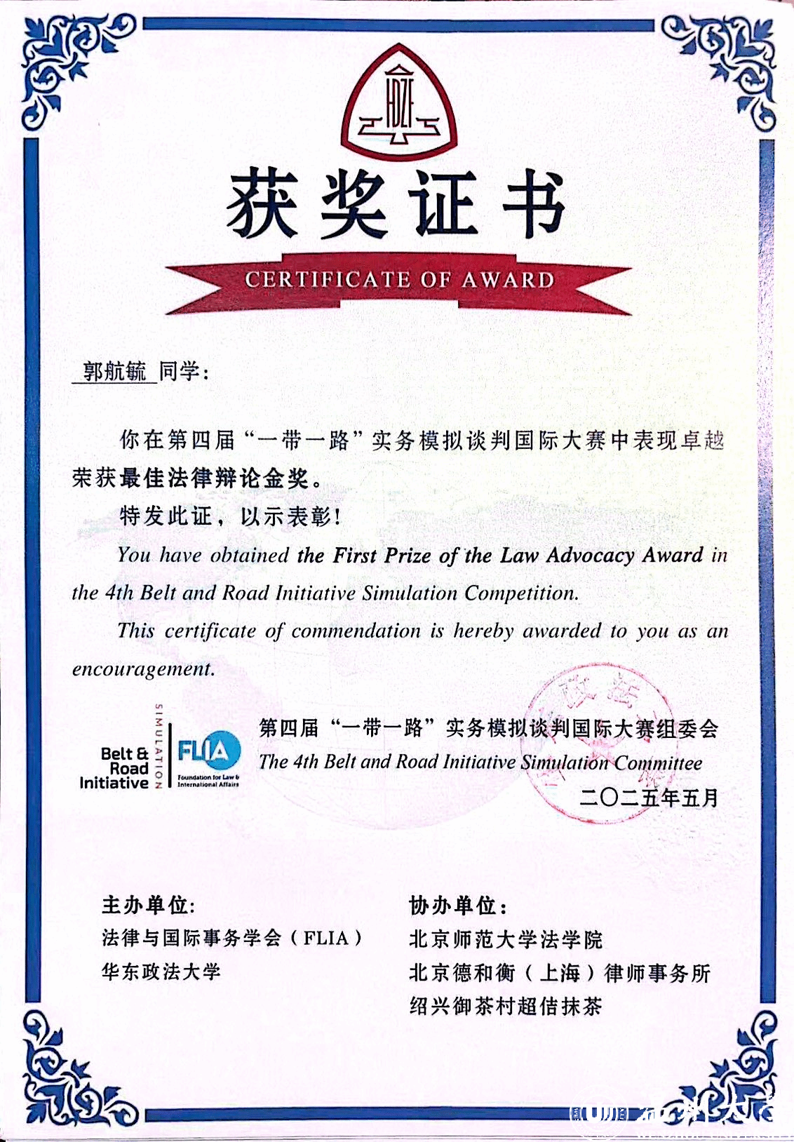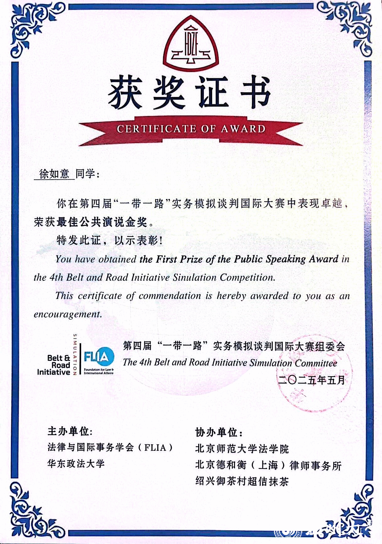 2025年5月10日至11日,第四届“一带一路实务模拟谈判国际大赛”在华东政法大学松江校区圆满落幕!来自全国68所高校的精英学子齐聚一堂,以智慧与激情展开巅峰对决。在这场国际化的赛事中,黄色视频 代表队凭借扎实的专业功底与默契的团队协作,勇夺团体铜奖! 23级国际经贸规则班郭航毓同学、23级法学2班徐如意同学分别获最佳法律辩论金奖、最佳公共演说金奖。