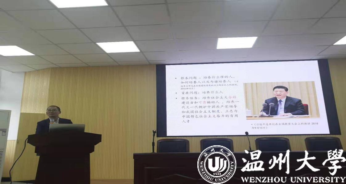 行政管理系系主任朱家德老师分享了“不忘初心,做一个让党放心让人们满意的可靠教师”的主题汇报。他通过引用习近平总书记在2018年9月10日全国教育大会上的讲话,点明了教育者们培养社会主义建设者和接班人的重要性,对如何处理好教学和科研的关系,以及如何处理好自由与责任的关系作出了具体的阐释,倡导做让党放心、让人民满意的优秀教育者。