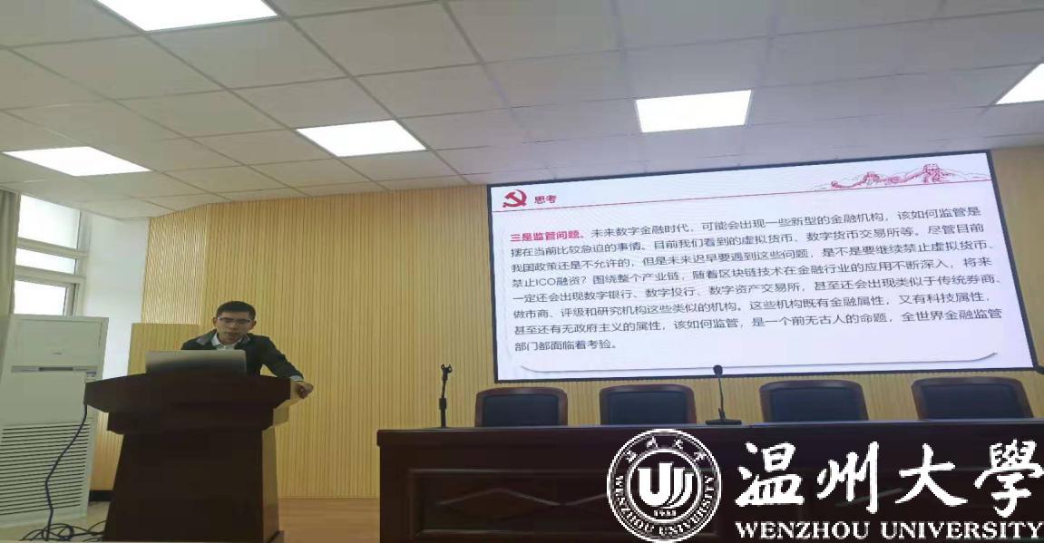 随后,行政管理系党员教师张鹏通过十九届四中全会会议精神引出“坚持以人民为中心,推动国家治理体系和治理能力现代化”的主题汇报,详细介绍了国家治理体系现代化和国家治理能力现代化的内涵,并倡导每一个人都应做好本职工作,为中华民族的伟大复兴添砖加瓦。行政管理系党员教师朱婉菁做了“习近平新时代青年教育观的所想所感”的主题汇报,阐述了富有时代性和建设性的青年工作和青年教育工作的相关思想及政策方针,论证了青年学子与中国命运的紧密联系。行政管理系党员教师戚学祥以“区块链技术:在过去与未来之间”为主题做了汇报,提出我们要把区块链作为核心技术自主创新的重要突破口,加快推动区块链技术和产业创新发展的要求。在教师党员们分享了思想汇报后,军转干部的代表也上台进行发言,呼吁新时代的青年们加强理论武装,树牢“四个意识”,坚定“四个自信”,坚决做到“两个维护”,并勇于担当作为。通过本次主题教育活动,提高了支部党员的理论素养,激发了党员们的工作热情和奋斗精神,营造了良好的学习氛围。