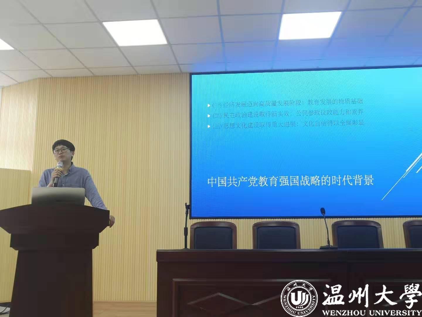 会上,行政管理系支部书记陈和老师从“两史两书一章、习近平总书记关于新时代中国特色社会主义的重要讲话”等内容出发,就中国教育事业的发展历程展开详细的主题汇报,主要讲述了中国共产党教育强国战略的时代背景、主要内容、特点,并且提出了国家发展和民族复兴是每一代中国人的历史责任等个人学习体会和思考。