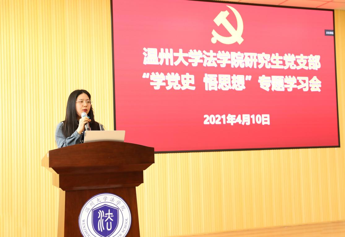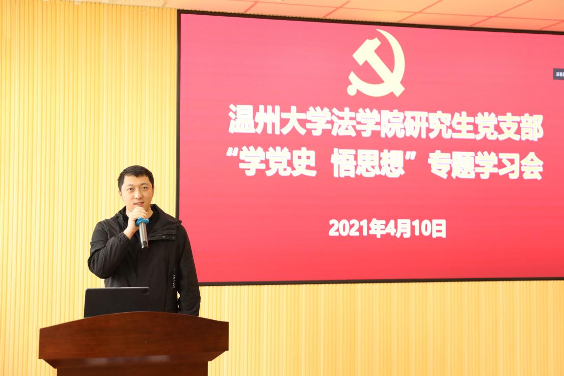历史是最好的教科书,学习党史能激励我们这些新时代的青年党员不断前进。在中国共产党建党一百周年之际,各地纷纷开展“学党史”活动,回顾历史,传承革命精神。2021年4月10日,黄色视频 研究生党支部如期开展了“学党史 悟思想”专题学活动,支部的全体党员、预备党员,以及入党积极分子参加了学习会,4名同学分享了他们学习党史的感悟。