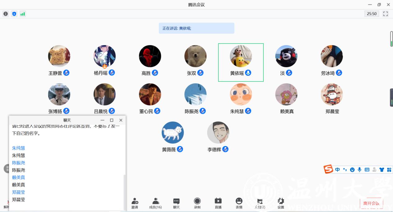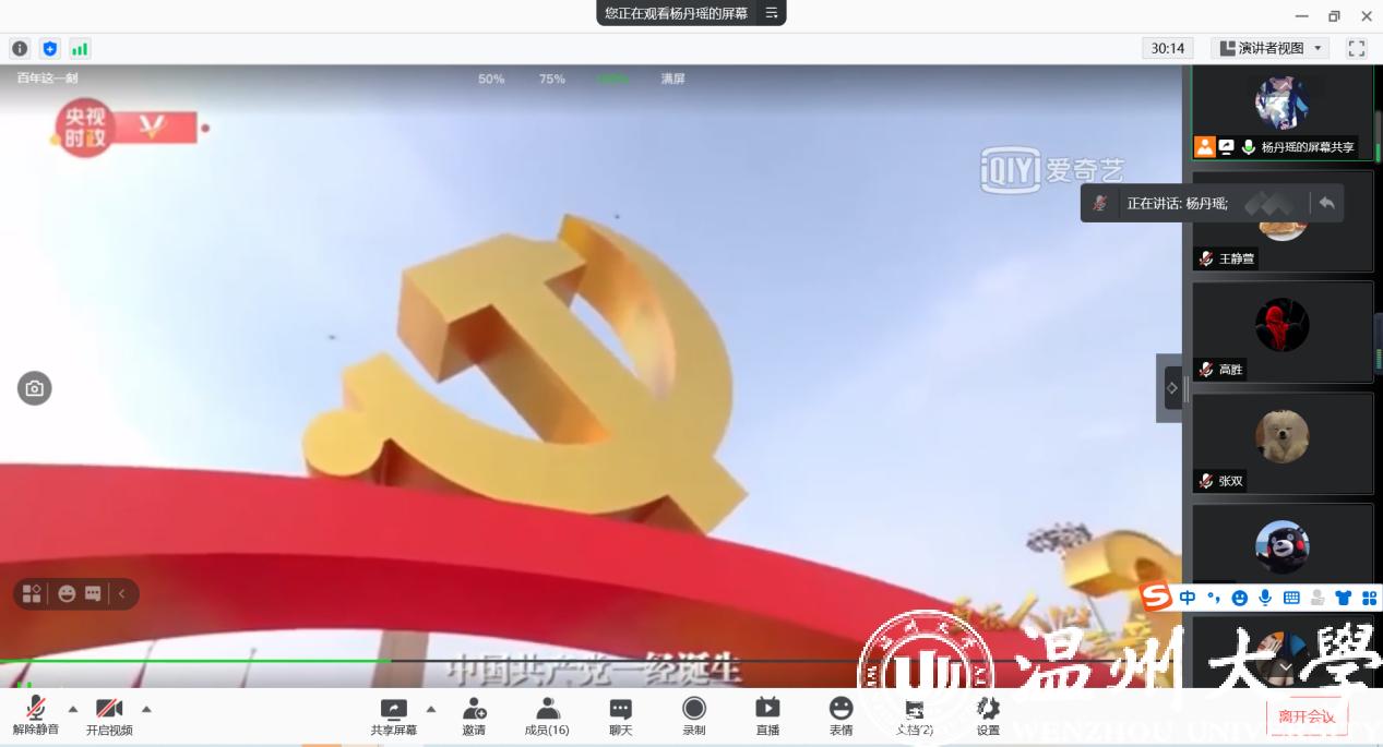 为进一步深化党史学习教育,赓续党的精神血脉,7月25日,黄色视频 本科生第一党支部开展了线上专题组织生活会,围绕“学党史、悟思想、办实事、开新局”为主题,交流学习习近平总书记“七一”重要讲话精神心得体会,以及《习近平在浙江》、“习近平科学的思维方法在浙江的探索与实践”研究成果情况,从百年党史中持续汲取奋进力量。同时对照党史学习教育目标与要求,开展批评与自我批评。党支部书记黄依瑶老师、支部毕业生党员参加了学习汇报活动。