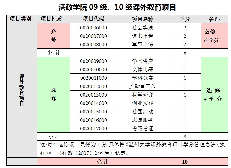 请参照法政学院09级、10级学生的课外教育项目的学分要求,登陆教务系统核实是否已修满规定的课外学分。如果课外学分还不够,请根据附件《关于做好09、10级学生课外教育项目学分申报的通知》填写相关表格申请。特别是09级学生,必须重视,避免因课外学分不够而影响毕业。