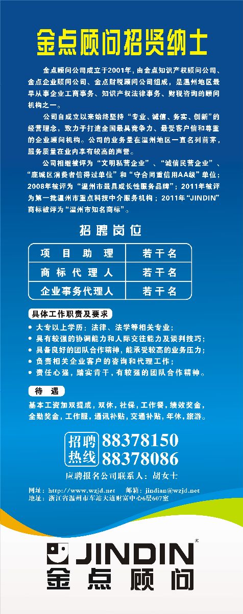 应聘报名公司联系人:胡女士 电话:0577-88378150 88378086