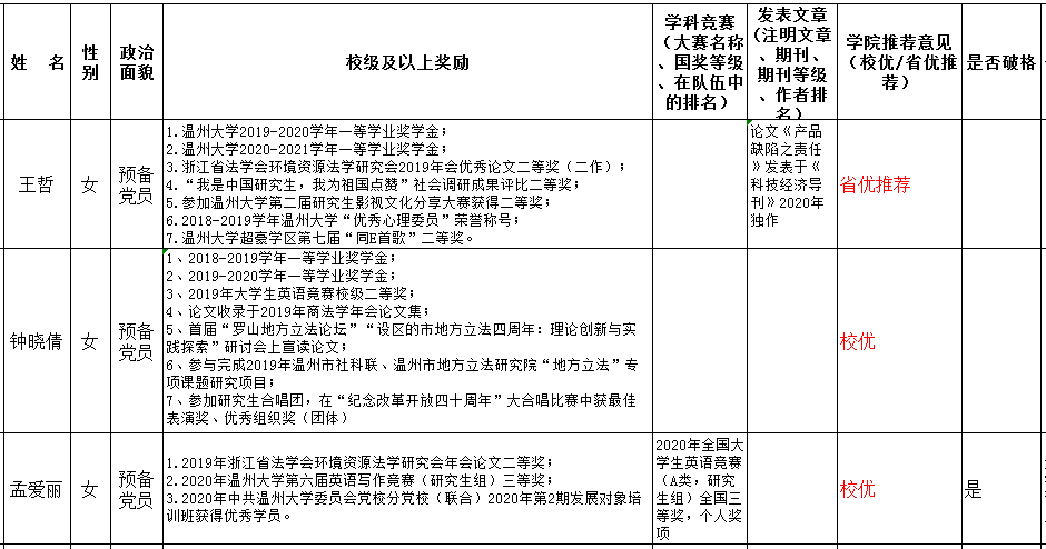 根据《黄色视频 研究生优秀毕业生评选办法》(行政〔2019〕225号)(附件1)文件精神,学院组织开展了2021届研究生省、校级优秀毕业生的预评工作。黄色视频 名额:省优1人、校优1人。通知发出后,有5名学生报名参评。其中孟爱丽同学获得全国大学生英语竞赛三等奖,破格推荐评为校级优秀毕业生,不占用学院名额。学院审核申报者的材料,由学生工作委员会根据学生的学习成绩、获奖、科研成果、平时综合表现等情况投票,决定推荐王哲参加省优毕业生评选、推荐钟晓倩评为校优毕业生。具体由学校研究生工作部复审后公示最终的评选结果。现将学生的基本信息公示如下: