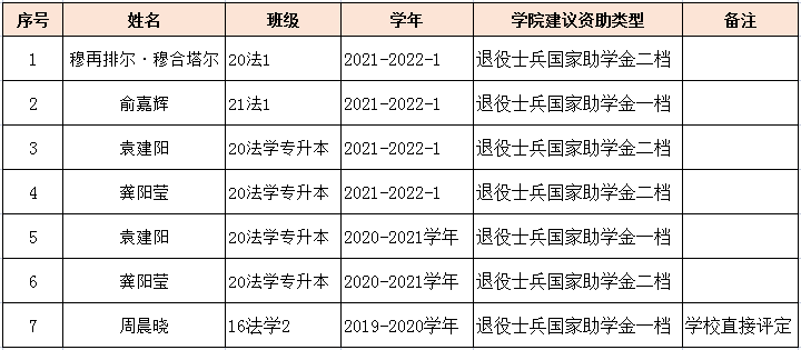 根据学校关于《关于做好退役士兵国家助学金评定工作的通知》,学院开展2021-2022学年退役士兵国家助学金发放工作。根据学生申报、学院学工委评议,现将建议资助名单上报学校学工部,由学校学工部复审后对学生给予资助。其中一档资助4500元/生/年,二档资助2700元/生/年。拟资助名单如下: