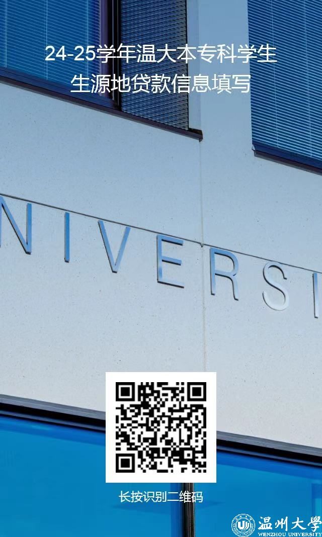 根据国家开发银行生源地信用助学贷款手续办理的要求,学生在生源地办理完信用助学贷款后,需要高校在限定时间内进行网上回执录入,请办理国开行生源地贷款的新老生,务必在9月20日前在网上完成《24-25学年温大本专科学生生源地贷款信息填写》,二维码如下: