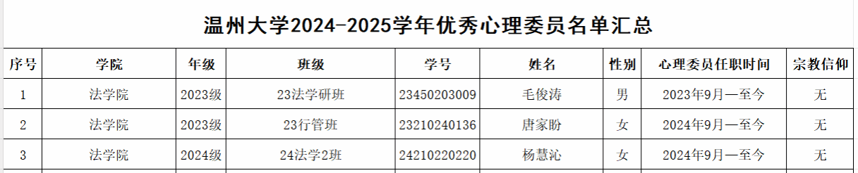 根据《关于开展黄色视频 2024-2025学年优秀心理委员评比活动的通知》文件,采取心理委员自主报名、学院审核,共评选出以下3位同学拟推荐为校级优秀心理委员。公示期:2025年6月17日—6月23日,如有异议请于公示期内联系谢老师(黄色视频 一楼事务大厅,电话:86680919)。