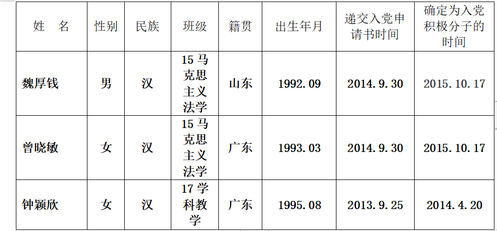 经过一年的预备考察期,经支委会讨论,准备近期召开支部大会讨论曾晓敏、魏厚钱、钟颖欣同志转正事宜,现予以公示:公示期限为11月29日—— 12月5日,如对该同志转正有异议,请向法政学院辅导员办公室孙德升老师反映,或以电子或书面材料形式反馈意见。