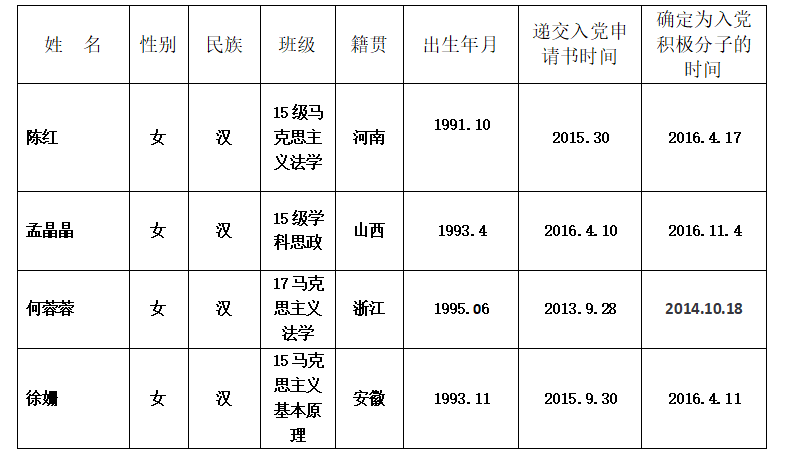 经中共黄色视频 法政学院研究生党支部培养考察,认为以下同志(具体名单附后)已基本具备中共预备党员条件,拟于近期发展,现予以公示。