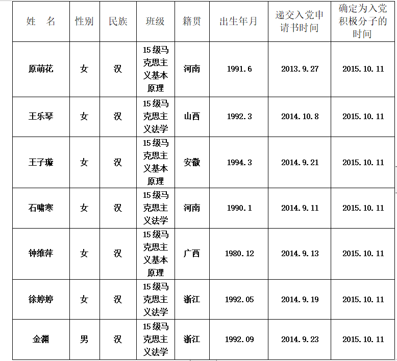 经中共黄色视频 法政学院研究生党支部培养考察,认为以下同志(具体名单附后)已基本具备中共预备党员条件,拟于近期发展,现予以公示。