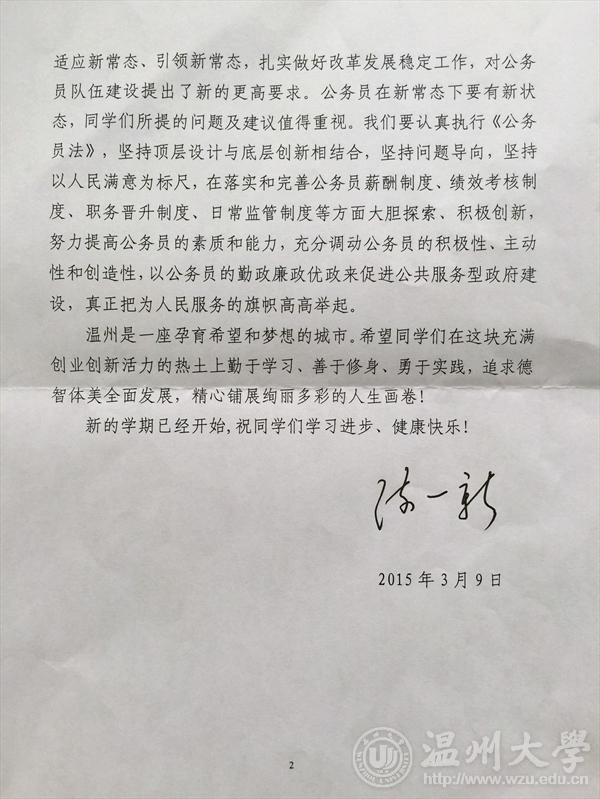 昨天,学生们收到了陈一新书记的回信,信中表示"学生们在学习之余,关注社会热点问题,并积极开展专题调研,分析问题、提出建议,体现了当代大学生良好的社会责任感。"同时寄语大学生们在这块充满创业创新活力的热土上勤于学习、善于修身、勇于实践,追求德智体美全面发展,精心铺展绚丽多彩的人生画卷!