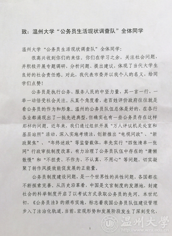 11月2日,一封承载着学生期待的信,寄给了省委常委、市委书记陈一新。信件里,学生们介绍了调研的主要情况,提出了自己意见和建议,还请陈一新书记支招,指导大学生们如何在建立群众和公务员之间的信任和沟通渠道上发挥作用。