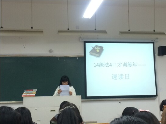 启动仪式后,法4班在法政楼308教室开展口才训练系列活动之速读日活动。同学们经过两个星期的充分准备,想一展速读训练成果,有的读四中全会报告,有的读散文,还有同学读宪法序言,语音标准,吐字清晰,阅读如行云流水。教室里不时爆出阵阵掌声和欢笑,掌声和赞许中包涵了对自己和同学的鼓励与认可。最后,经过大家投票,学习委员许晓地同学以16票的压倒性优势赢得了最终胜利。
