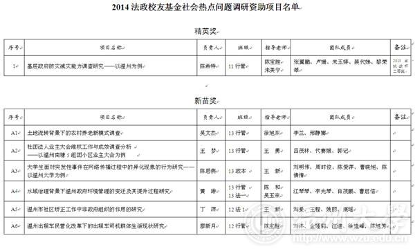 月10日下午,2014法政校友基金资助项目公布暨颁奖仪式在法政楼一楼报告厅隆重举行。法政校友基金理事会陈瑛理事长、谢忠旭副理事长、张炘副理事长和法政学院钭晓东院长、王柏民书记、王宗正副院长出席,学生科科长孙德升和全体获奖项目团队学生参加仪式。
