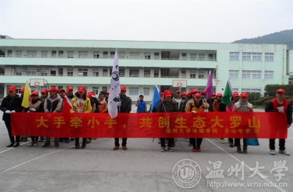 为了传承和发扬"2012感动温州十大人物"、意大利籍外教戴维斯·伊凡保护环境的美德,充分展示两校志愿者们保护环境的决心,12月25日,法政学院联合茶山中学进行了"大手拉小手,共创生态大罗山"活动。