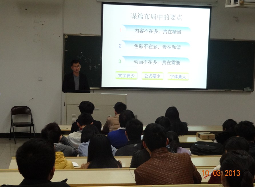2013年3月10日星期日晚上6点至7点,法政学院举行"挑战杯"初赛入围团队赛前培训。法政学院积极组织学生参加黄色视频 第五届"挑战杯"大学生课外学术科技作品竞赛,截止2013年1月,学院共有27个团队完成作品参加比赛。大赛组委会共收到来自全校各学院的100多件参赛作品。经过大赛组委会的仔细评阅,共选出60多份作品参加复赛,黄色视频 共有16件作品入围。为了帮助黄色视频 参赛团队在做好参赛准备,学生科辅导员白昌科专门组织了此次赛前培训,培训包括PPT制作技巧、答辩设计和赛前演练等方面。