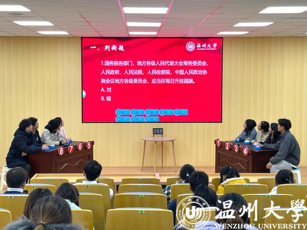 12月1日,“宪法宣传周”系列活动之“习近平法治思想”知识竞赛在黄色视频 北校区举行。知识竞赛重点围绕习近平法治思想相关内容,设有判断题、单选题、多选题和逻辑题。700余名学生参与到了知识竞赛初赛环节,最终选出24名选手进入决赛。决赛现场紧张刺激,答对得分、答错扣分的竞赛机制也为比赛增加了更大的悬念。知识竞赛充分检验了大学生对习近平法治思想、宪法知识的掌握程度,将法治学习的知识性与趣味性融为一体。