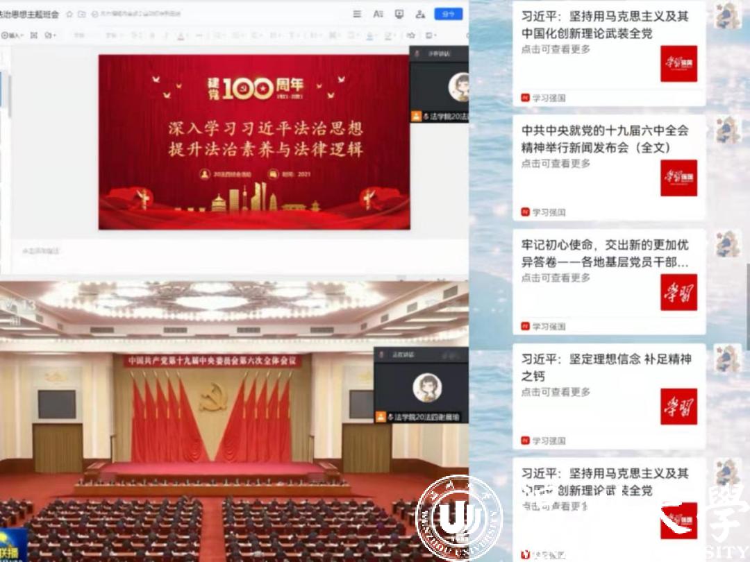 20法学1班、21法学2班、21法学4班等班级通过线上与线下相结合的方式开展了此次班会。在线下开展习近平法治思想宣传,巩固习近平法治思想入脑入心;在线上通过问卷的方式,以问答的形式加强同学们对于习近平法治思想的把握,通过碎片化的抽查方式,提醒同学们应当注意的重点与难点,积极锤炼同学们的法律素养。