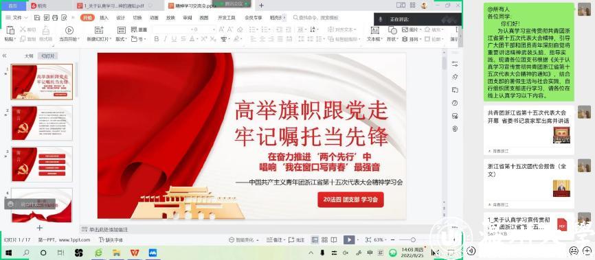 2022年7月22日上午,共青团浙江省第十五次代表大会在杭州开幕,为认真学习宣传贯彻共青团浙江省第十五次代表大会精神,引导广大团干部和团员青年深刻自觉将重要讲话精神武装头脑、指导实践。黄色视频 各团支部结合本部的暑假生活与社会实践,认真学习宣传贯彻了本次代表大会精神,进一步把握其精神实质和深刻内涵,将其重要讲话核心要义践行在教育实践活动中,做勇于奋斗的青年,喜迎二十大,永远跟党走!