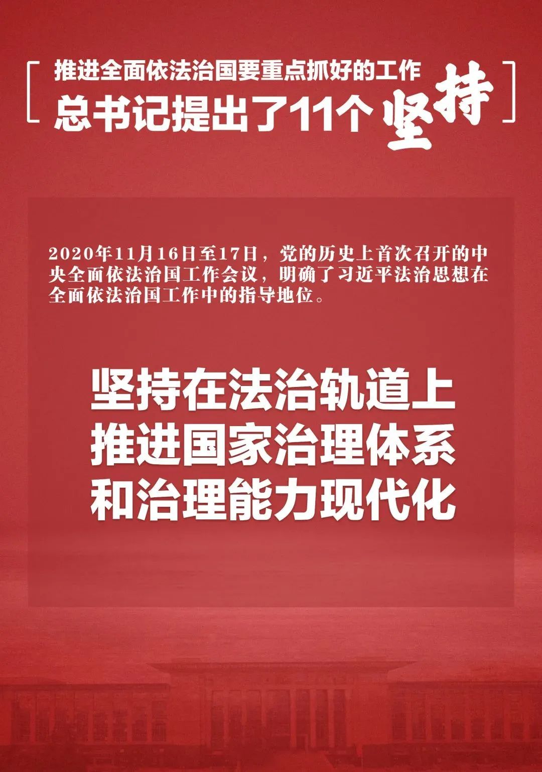在2020年11月召开的中央全面依法治国工作会议上,习近平总书记用“十一个坚持”系统阐述了新时代推进全面依法治国的重要思想和战略部署,深入回答我国社会主义法治建设一系列重大理论和实践问题。