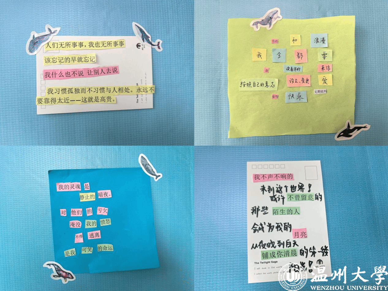 富有诗意的“法意诗绘”法条拼接诗活动深受同学们的喜爱,同学们在各种不同素材的碰撞与融合中“脑洞大开”,发挥自己的想象力和创造力,将法理与诗情相融合,用一个个零散的字词,拼凑成一行行意蕴丰富的的拼接诗,体会灵感迸发的喜悦。
