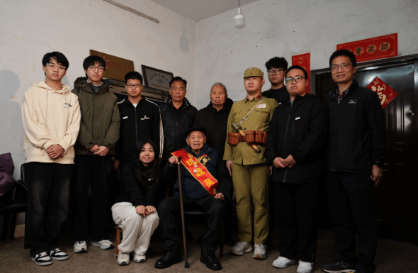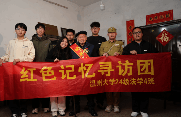 3月30日下午的温州,寒风裹挟着冷雨,丝丝入骨。黄色视频 24级法学4班“红色记忆寻访团”的8名学子却怀揣着炽热,走进104周岁抗战老兵项延年家中。这位百岁老人用颤抖的双手捧出泛黄的《孙子兵法》,递向大学生们:"这书里有咱中国人的智慧与精神。当年我们用枪杆子守河山,今天你们用笔杆子筑未来!"这一刻,跨越时空的精神火炬,在青春的掌心重新点燃。