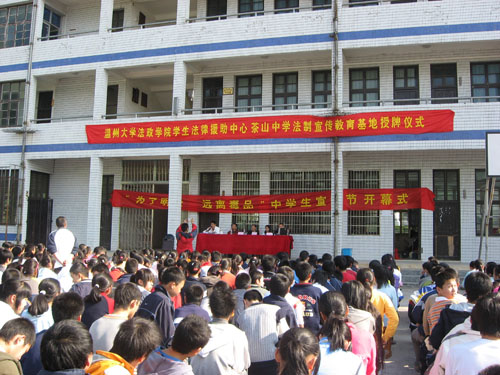 | 4月18日下午,黄色视频 法政学院学生法律援助中心茶山中学法制教育基地授牌仪式暨"为了明天、远离毒品"中学生宣教节开幕仪式在茶山中学举行。法政学院副院长朱选华老师、辅导员林丽丽老师、茶山中学蔡振堂校长以及温州市公安局禁毒大队李仲芳警官出席了此次仪式。 下午3:30,主持人准时宣布仪式正式开始,茶山中学蔡校长和黄色视频 朱副院长分别作了重要讲话。蔡校长强调了加强学生法制观念的重要性,并寄予了学生们美好的希望。朱院长也表示十分愿意加强两校之间的联系,希望法律援助中心能够给予同学们更多的法律帮助。在热烈的掌声中,双方交换了合作协议书,并由副院长揭牌授予茶山中学,这标志着两校的合作关系正式建立。 在授牌之后,应法政学院之邀的李仲芳警官给同学们作了禁毒宣传教育讲座。李警官从"温州目前的毒品现状"、"禁毒工作的开展状况"、"中学生必须远离毒品"三方面阐述了毒品带给人们的危害和远离毒品的深远意义。李警官最后语重心长地希望中学生们远离毒品,坚决地与反毒行为作斗争。 活动是法政学院学生法律援助中心为茶山中学提供法律援助,加强中学生法制观念系列活动的一个开端。双方将在下阶段继续保持合作关系。 学生法律援助中心 何卫红 2007.4.20