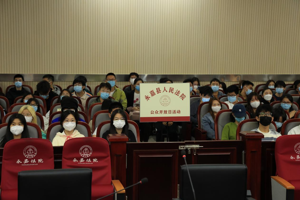 4月27-28日,21法学3、4班95名本科生在黄色视频 法律系谢丽珍老师、王艺曌老师、周浩仁老师带领下赴永嘉县法院开展《模拟法庭》实践教学活动,通过“零距离”观摩庭审,旁听一起刑事案件的审判。